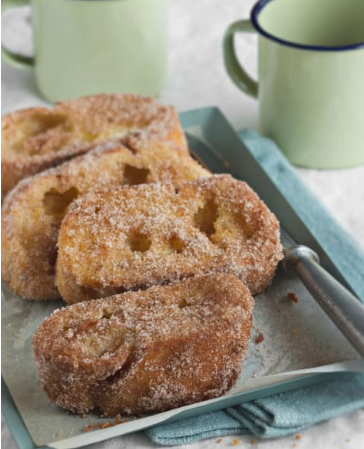 - Desenvuelva las rodajas de pan con cuidado, rebócelas por ambos lados en la mezcla de azúcar y canela y colóquelas en la bandeja de horno forrada con papel de hornear.